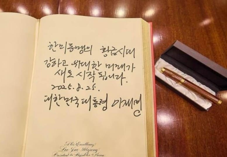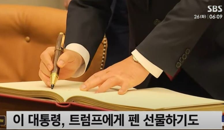 2025년 8월 워싱턴에서 열린 한미정상회담. 방명록 서명 장면에서 이재명 대통령이 사용한 펜이 화제가 됐습니다.